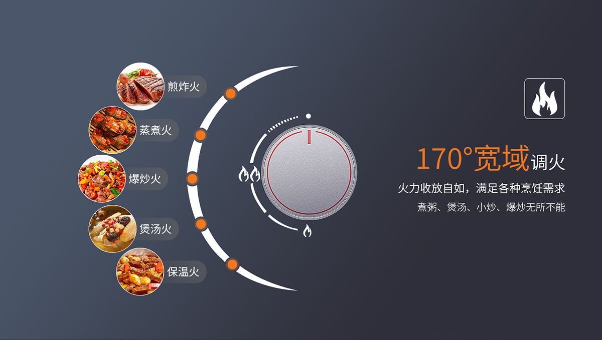 - 無(wú)極寬域調(diào)火,0°-170°收放自如,滿足各種烹飪火力需求
